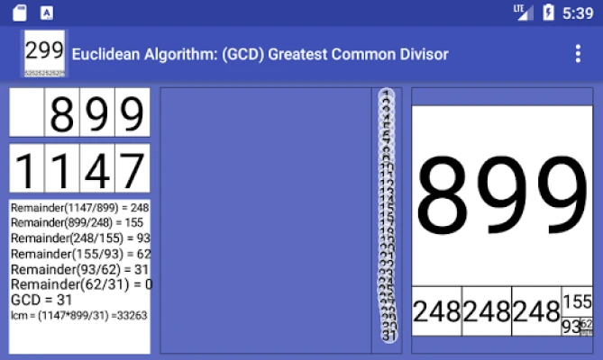 Ponorte sa do sveta čísiel s nástrojom Greatest Common Divisor, ktorý je navrhnutý pre prehľadné pochopenie základných matematických princípov. Táto aplikácia vám pomôže nielen s elegantným zjednodušovaním zlomkov, ale aj s hlbším porozumením kľúčového pojmu v aritmetike. Či už ho poznáte ako najväčší spoločný deliteľ (NSD), najvyšší spoločný faktor (HSF) alebo najväčšiu spoločnú mieru, táto aplikácia vám vizuálne priblíži jeho výpočet. Objavte dynamickú a geometrickú reprezentáciu Euklidovho algoritmu, ktorá mení abstraktné matematické operácie na intuitívny vizuálny zážitok.