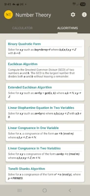 Táto aplikácia však ide oveľa ďalej, než len základné operácie. Poskytuje sadu výkonných algoritmov na riešenie komplexných matematických problémov. Riešte lineárne Diofantické rovnice, lineárne kongruencie s jednou či dvomi premennými a kvadratické zvyšky pomocou Tonelli-Shanksovho algoritmu. Využite rozšírený Euklidov algoritmus, nájdite modulárne faktory alebo si prezrite zoznam usporiadaných prvočísel. Od jednoduchých kvadratických foriem až po detailné analýzy faktorov, tento nástroj je nepostrádateľným spoločníkom pre študentov, výskumníkov a kohokoľvek, kto čelí výzvam vysokej matematiky. Výkonnosť aplikácie sa prirodzene odvíja od zariadenia, ktoré používate.