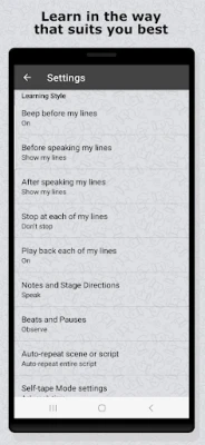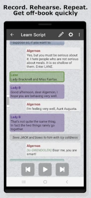 Objavte flexibilné metódy nácviku šité na mieru vášmu štýlu učenia. Potrebujete si len vypočuť? Režim "Počúvať" vám umožní prehrať celý scenár. Preferujete interaktívny tréning? Funkcia "Čakať na mňa" pozastaví prehrávanie pri vašich replikách, kým nie ste pripravení pokračovať. S "Opakovať pre potvrdenie" máte priestor na povedanie linky, po ktorej aplikácia automaticky potvrdí správnosť. Alebo si vyskúšajte "Plynulý nácvik", kde po vašej replike okamžite pokračuje s ďalšou. Script Rehearser je navrhnutý pre telefóny aj tablety a prináša vám komplexnú kontrolu nad každým krokom učenia, aby ste dosiahli plynulosť a sebaistotu vo vašom vystúpení.
